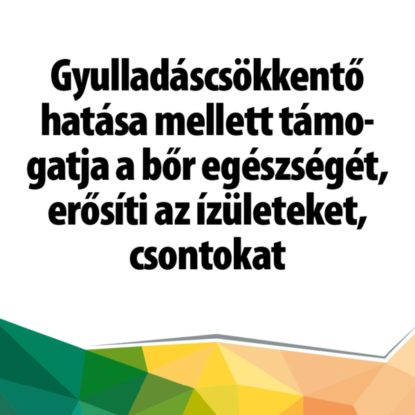 Gyulladáscsökkentő hatása mellett támogatja a bőr egészségét, erősíti az ízületeket, csontokat. Természetes vitaminokat tartalmazó készítmény.