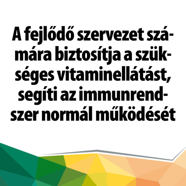 A fejlődő szervezet számára biztosítja a szükséges vitaminellátást, segíti az immunrendszer normál működését. Természetes vitaminokat tartalmazó készítmény.