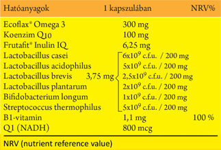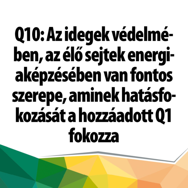 Q10: Az idegek védelmében, az élő sejtek energiaképzésében van fontos szerepe, aminek hatásfokozását a hozzáadott Q1 fokozza. Természetes vitaminokat tartalmazó készítmény.