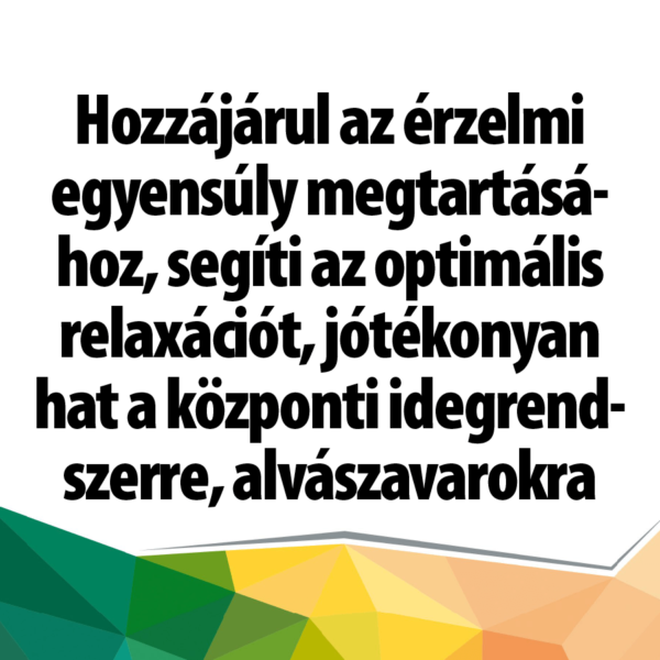 Hozzájárul az érzelmi egyensúly megtartásához, segíti az optimális relaxációt, jótékonyan hat a központi idegrendszerre, alvászavarokra. Természetes vitaminokat tartalmazó készítmény.